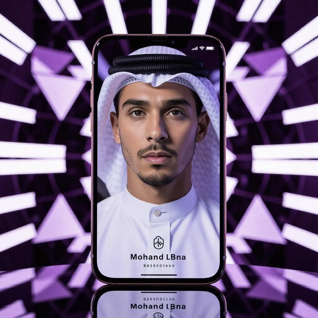 Craft a futuristic smartphone with a laser-engraved metallic backplate featuring Muhammad Al-Banna's portrait—detailed round face, styled black hair, and confident expression. Includes sleek "Muhammad Al-Banna" logo etching, mounted on a high-tech stand with neon light reflections. AI-powered precision for exclusive luxury tech designs. Explore vivago.ai's tools for professional-grade custom visuals.