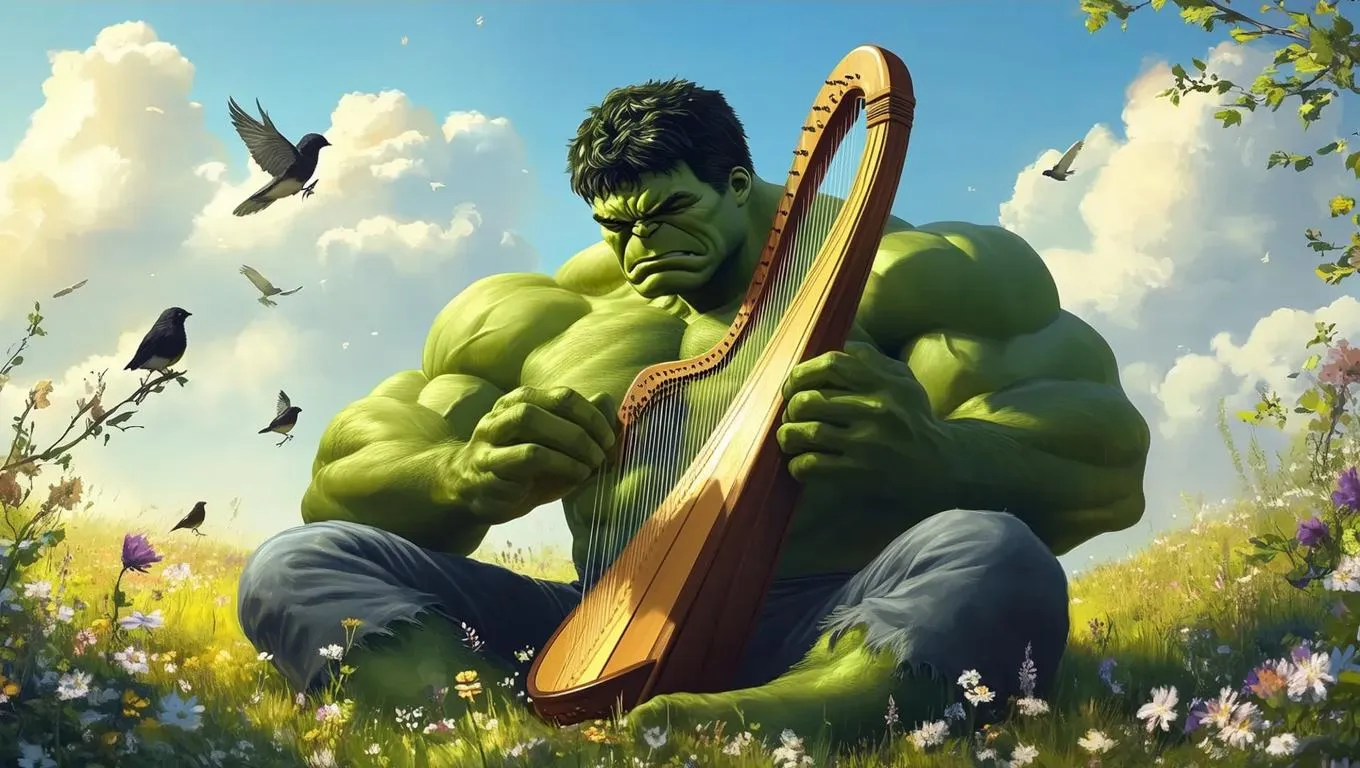 Hulk, a towering green giant with a calm expression, sits in a tranquil meadow, playing a delicate harp. His muscles are relaxed, and his eyes convey a sense of peace. Birds perch on nearby flowers and branches, adding a serene touch to the scene. The sky above is a clear blue, with fluffy white clouds drifting lazily. Soft, warm sunlight filters through, casting gentle shadows and highlighting Hulk's green skin and the vibrant meadow. The style is realistic, with a touch of whimsical fantasy.