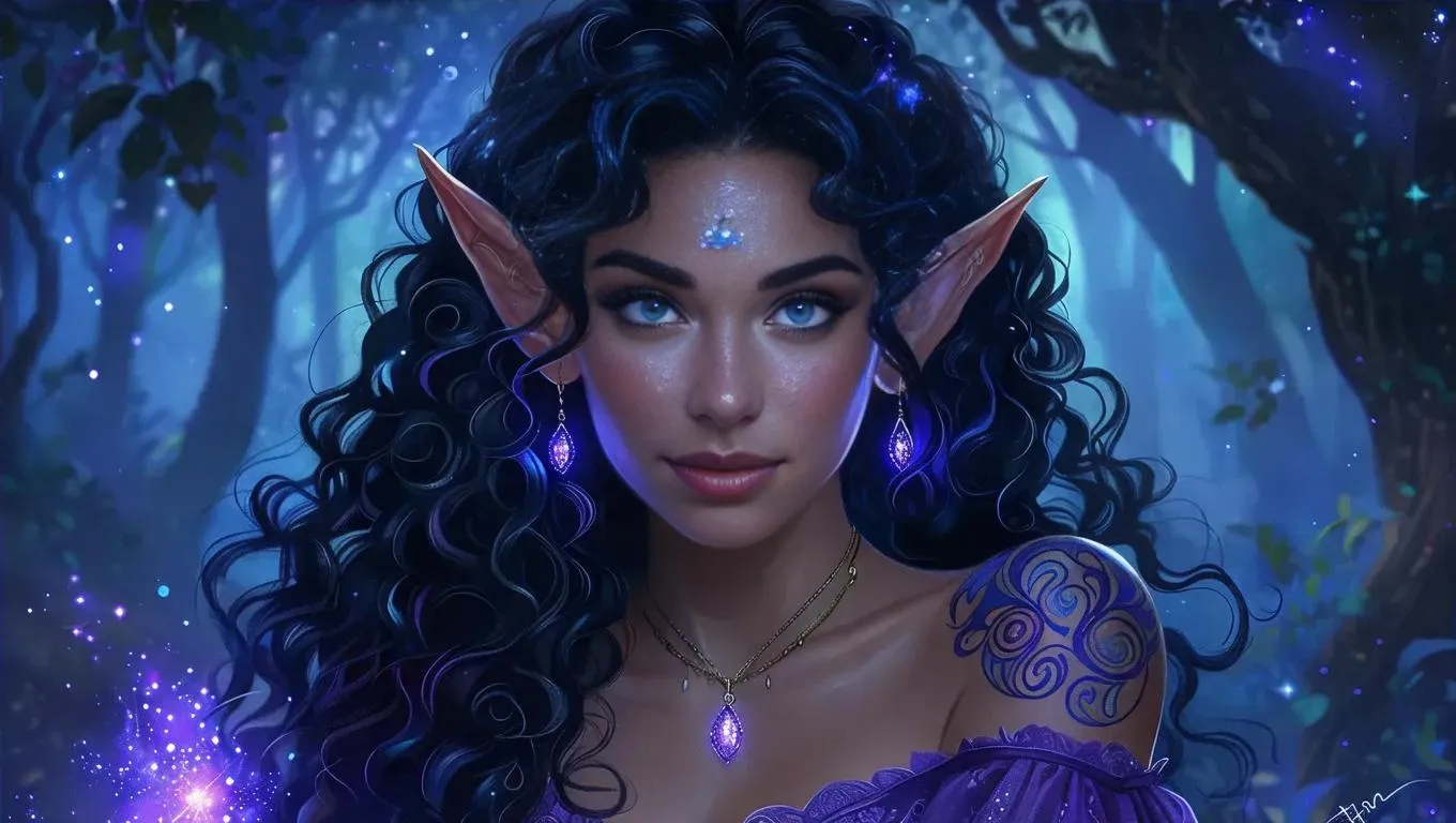 Generate a mystical female hobbit D&D character with cosmic flair—black curls, blue-violet eyes, glowing purple tattoos, and starry night ambiance. Perfect for medieval fantasy AI art. Create vivid AI-generated Dungeons & Dragons scenes in magical forests via VivaGO.ai.