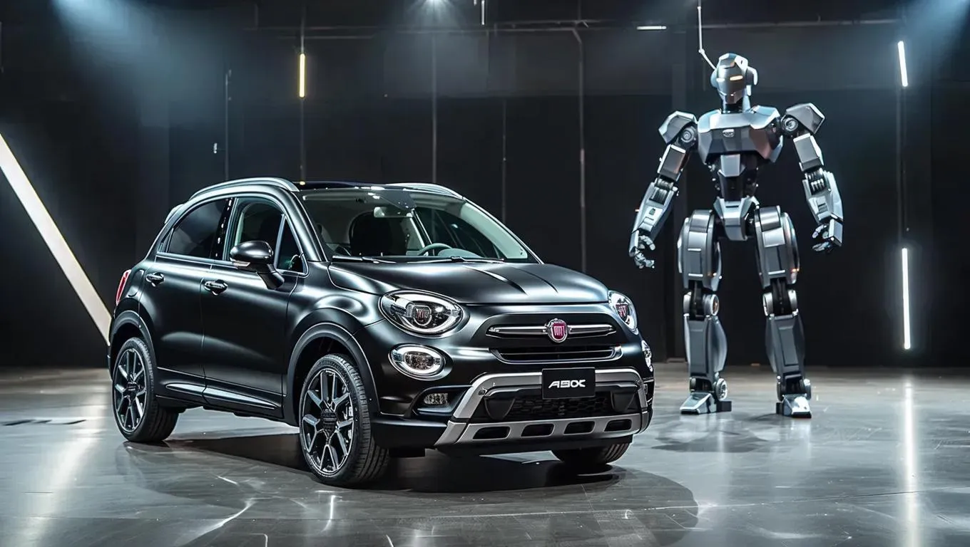 Generate striking Fiat 500X AI art with a bold black background and centered robot design. Explore futuristic automotive visuals using Vivago.ai's advanced AI image generator for creative, high-quality results.