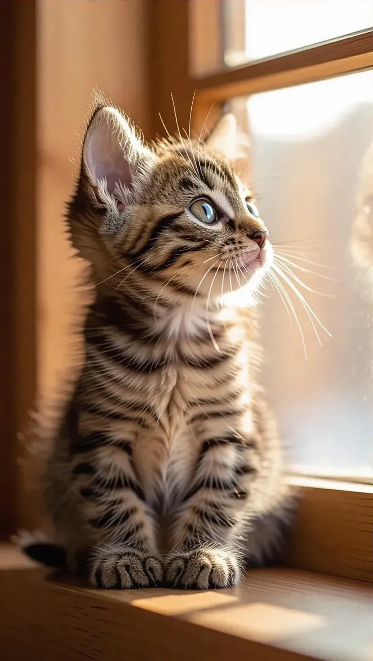 Create an adorable anime-style kitten with big, bright eyes perched on a wooden windowsill. Sunlight highlights its smooth fur and sparkling curiosity, perfect for vibrant wallpapers. Explore AI-generated anime art and creative tools for charming, professional-grade visuals at vivago.ai.
