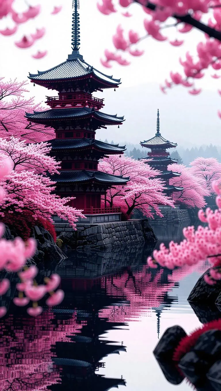Pastel shallow red, deep black, grays and bright white. Pink cherry blossom trees surround Japan ornate old japan depicted in surreal ancient Japanese architecture. Made on scrolls in ancient Japan with essence of a mystical past. High definition, psychedelic breathing quality