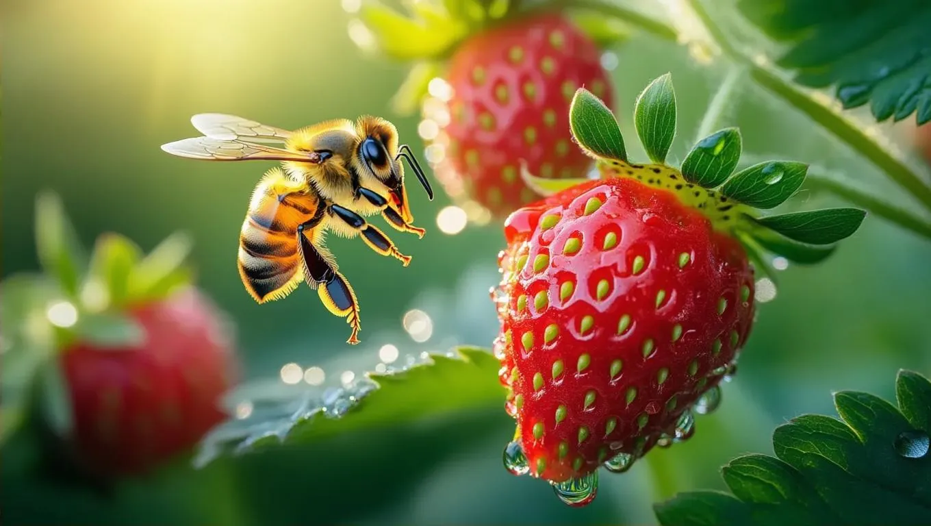 Generate a realistic AI image of bees pollinating strawberry flowers, capturing intricate textures and sunlight filtering through leaves. Enhance visuals with vivago.ai's AI tools for professional-grade natural scenes, detailed close-ups of nectar collection, and lifelike environmental effects in creative image generation.