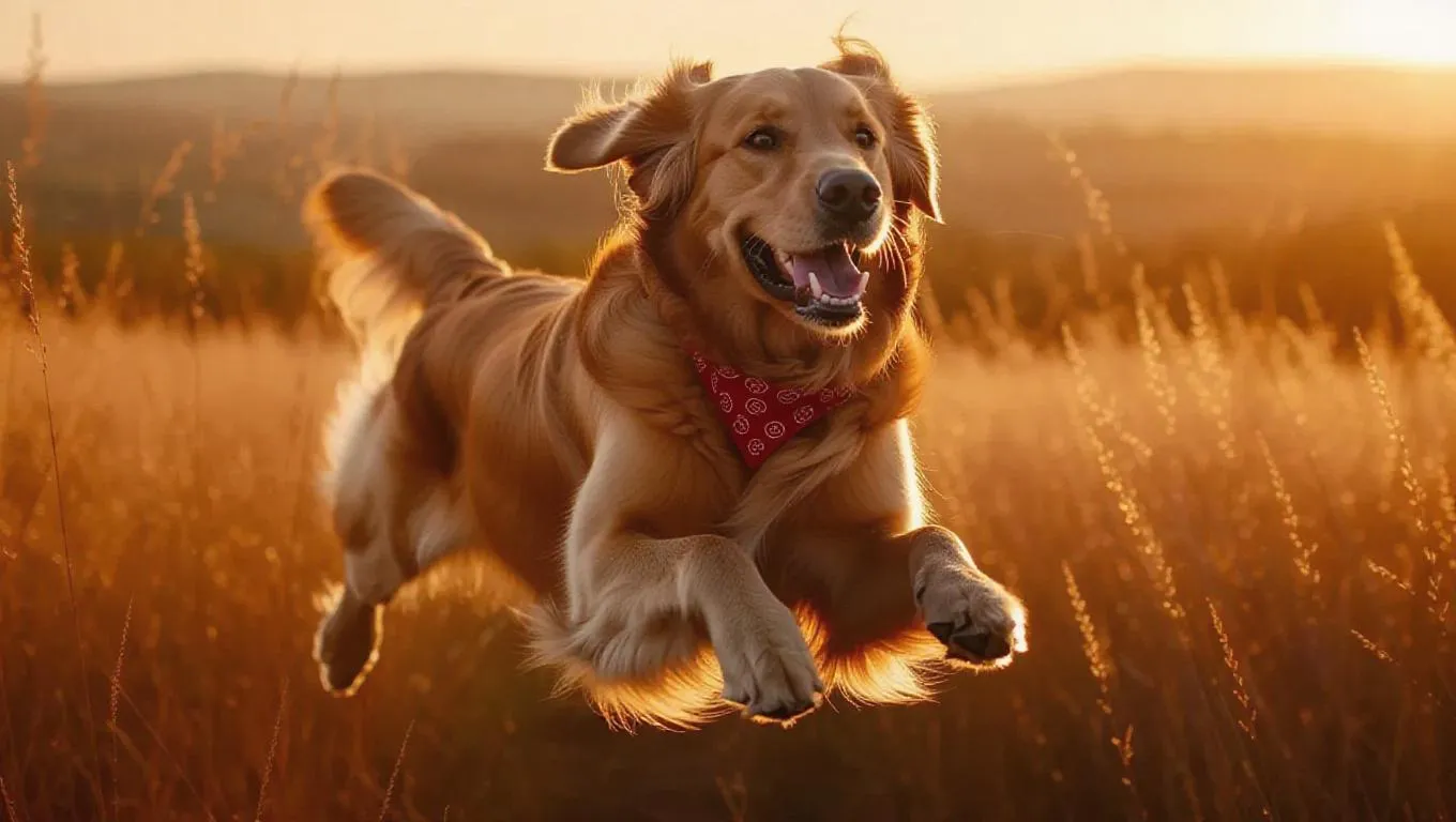 Capture stunning golden hour magic with AI-generated imagery of a golden retriever bounding through sun-drenched meadows. Ultra-high 8K resolution showcases flowing fur, dynamic motion blur, and sparkling dewdrops. Professional Canon EOS R5 effects recreate f/2.8 bokeh, vibrant bandana details, and golden hour's amber-lavender gradient sky for breathtaking visual storytelling.