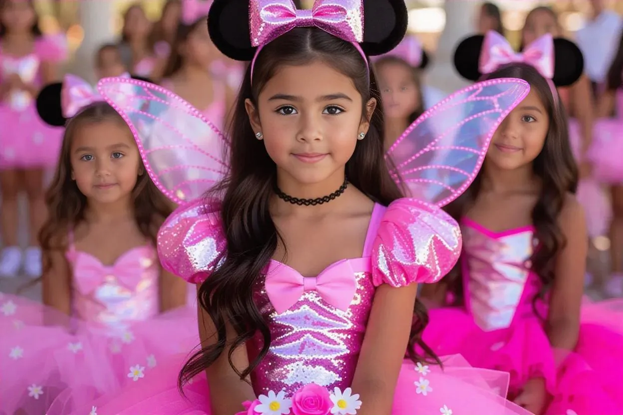 Create unique AI images of a Latino tween boy in a Minnie Mouse princess dress with wings, featuring intricate details like glitter and a flushed face. Transform prompts into professional AI-generated art featuring character transformation at a girls-only Disneyland setting with his sisters. Generate stunning, whimsical visuals with vivago.ai.