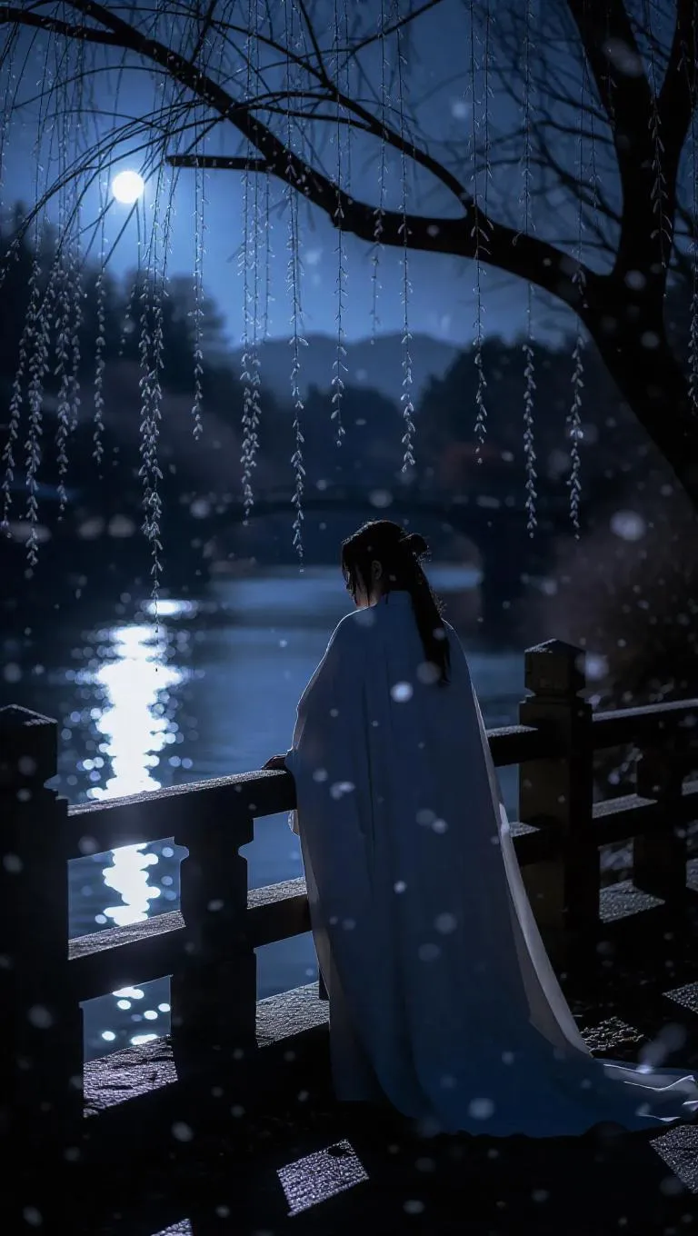 Craft ethereal Chinese-style AI art blending ancient ink painting aesthetics with subtle anime lighting. Depict a melancholic poet by a moonlit river, icy willow, and swirling snowflakes—traditional motifs meet modern AI-generated artistry for hauntingly beautiful visuals.