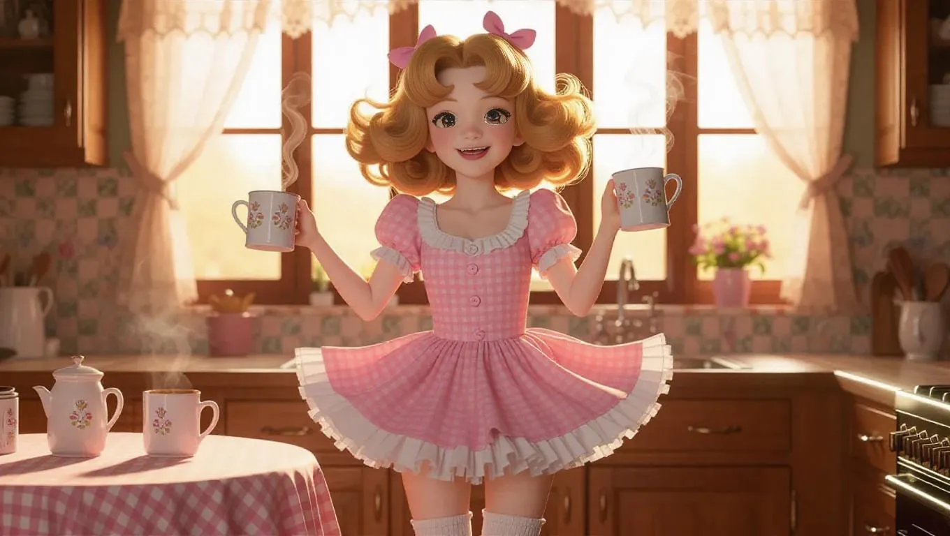 Generate vibrant AI anime art with a cheerful blonde girl in a sunlit kitchen. Features soft watercolor textures, glowing linework, cozy details like steaming mugs, embroidered bunnies, and a curious tabby cat. Ideal for whimsical anime scenes blending playful charm and AI-powered creativity.