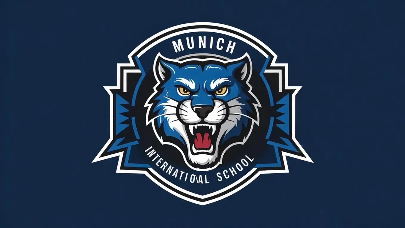 Create a dynamic AI-generated football badge featuring a fierce wildcat icon in Munich International School's blue, white, and black colors. This sleek, minimalist design combines bold typography with striking visuals, perfect for school sports branding. Boost team spirit with a professional, custom logo crafted by AI-powered tools for standout athletic identity.