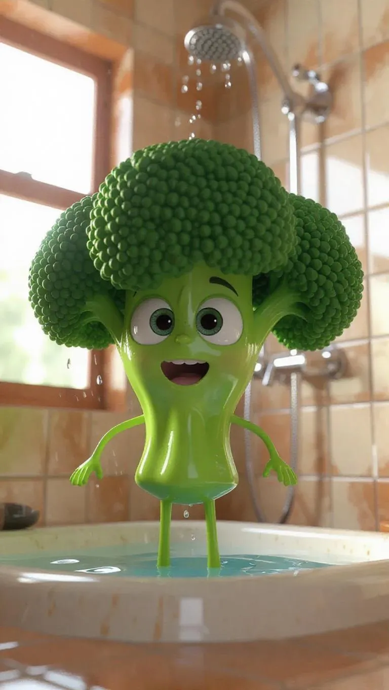 Broccoli 3d character animation , taking a shower