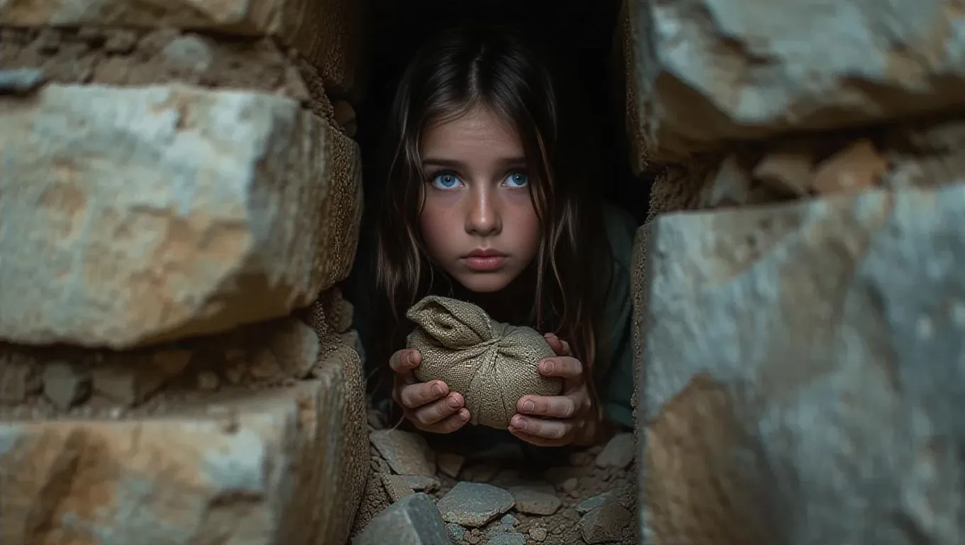 Dramatic AI-generated image depicts a desperate young prisoner trapped in an earthquake-carved stone crevice. A narrow crack reveals his outstretched hand clutching a cloth bundle, with haunting details of his dirty face and long hair. Powerful visual storytelling for dark narratives—create striking scenes with AI image generation tools.