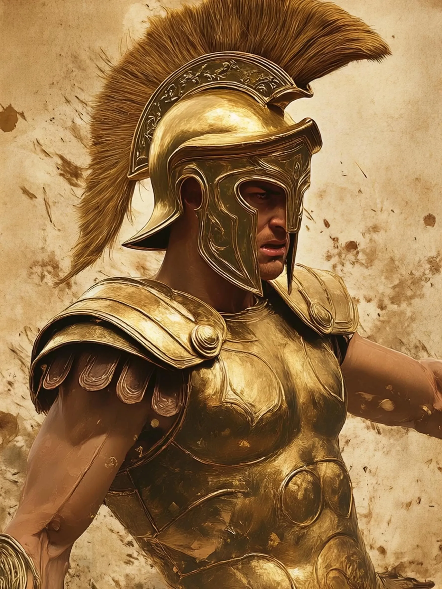 watercolor, portrait, Achilles ancient warrior, with golden hair, without a beard, in full armor, with a sword, rage and anger, detailed face, dramatic pose, dynamic pose, in motion, perfect anatomy, Ancient Greece, Art Nouveau, light by Caravaggio, detail by Vrubel, art botanical, vector graphics + vintage illustration, old gold, on old parchment,  sculptural, textured