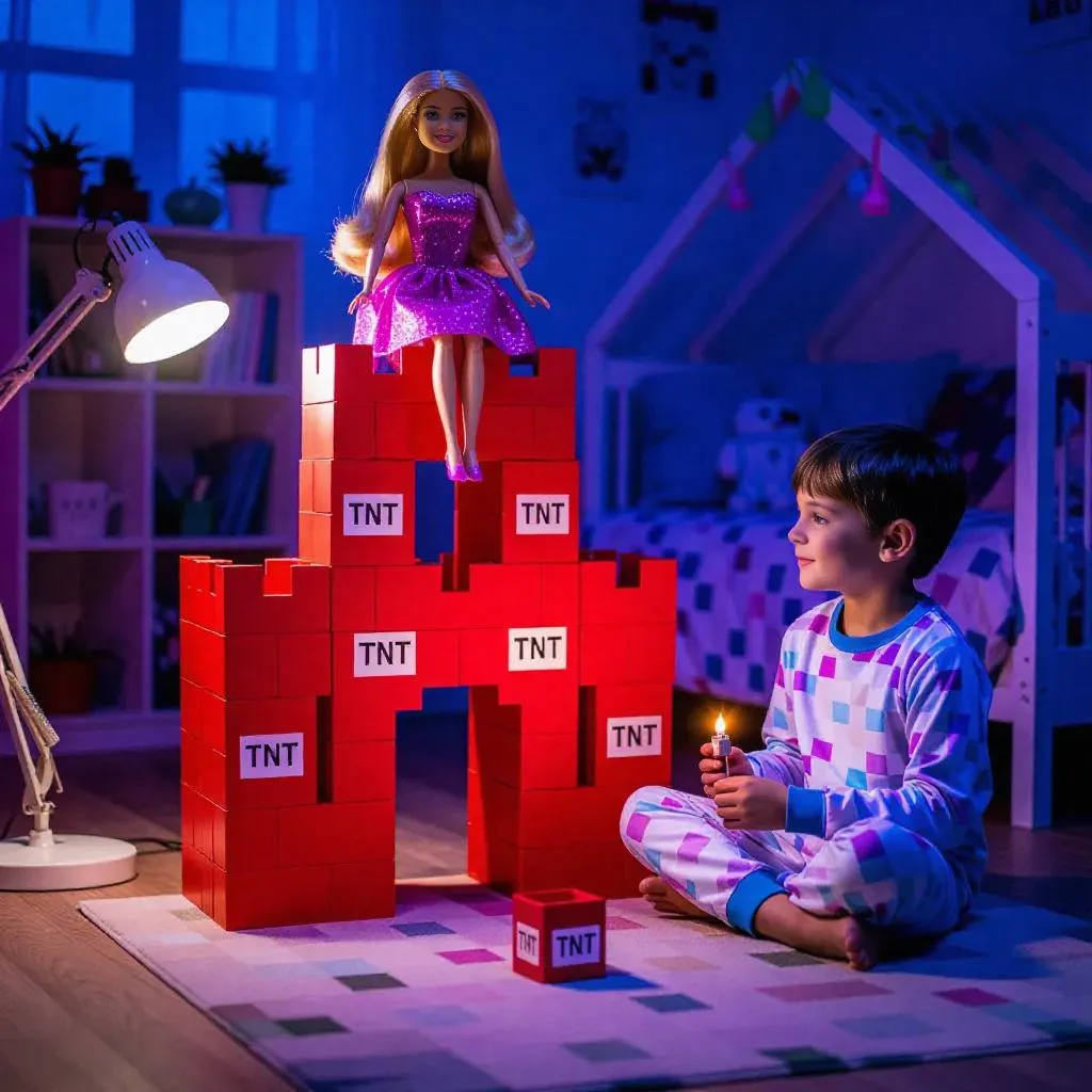 A photorealistic scene in a cozy child’s bedroom during late evening, lit only by a warm desk lamp. On the wooden floor stands a large toy house or castle built entirely from handmade paper blocks styled like Minecraft TNT — red paper cubes with hand-drawn 'TNT' labels, slightly crumpled edges showing childlike craft. At the top of the structure sits a Barbie doll in a sparkling pink dress, long blonde hair flowing as if guarding the tower. Nearby on the rug sits a 7-year-old boy in soft pixel-patterned pajamas, holding a toy lighter and gazing at the structure with a playful, focused expression. Around him are bookshelves, scattered toys, and Minecraft posters on the walls. The warm yellow light casts soft shadows across the room. The mood is cozy, imaginative, with a sense of mischief and creativity. The camera is at child-eye level, in a hyperrealistic style.