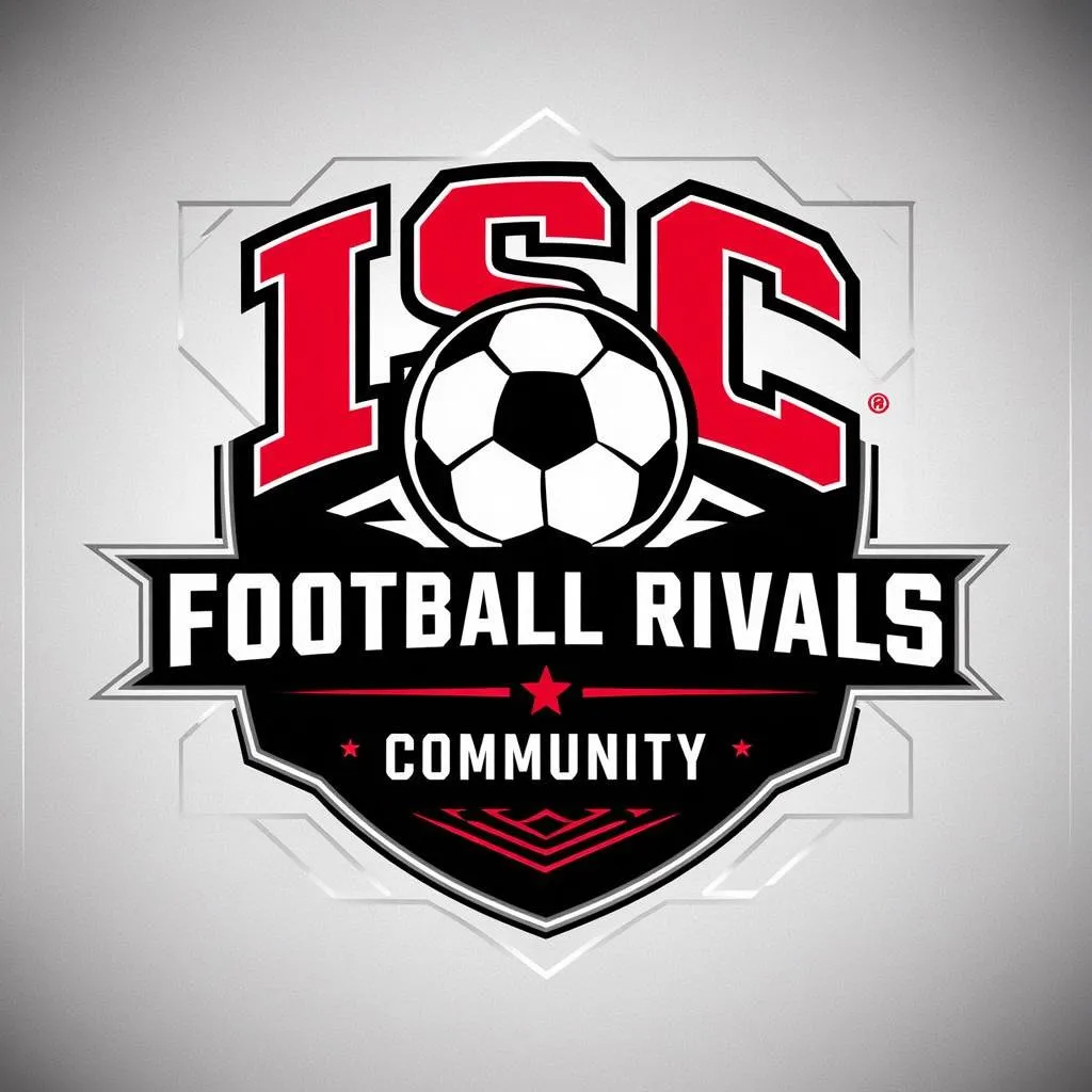 Create a bold, AI-generated soccer logo with vibrant red and black hues, dynamic football emblem, and striking "ISC" typography. Features "FOOTBALL RIVALS" in sleek italics and elegant "COMMUNITY" text for impactful sports branding. Perfect for teams, clubs, or community-driven football projects seeking professional, eye-catching visuals.