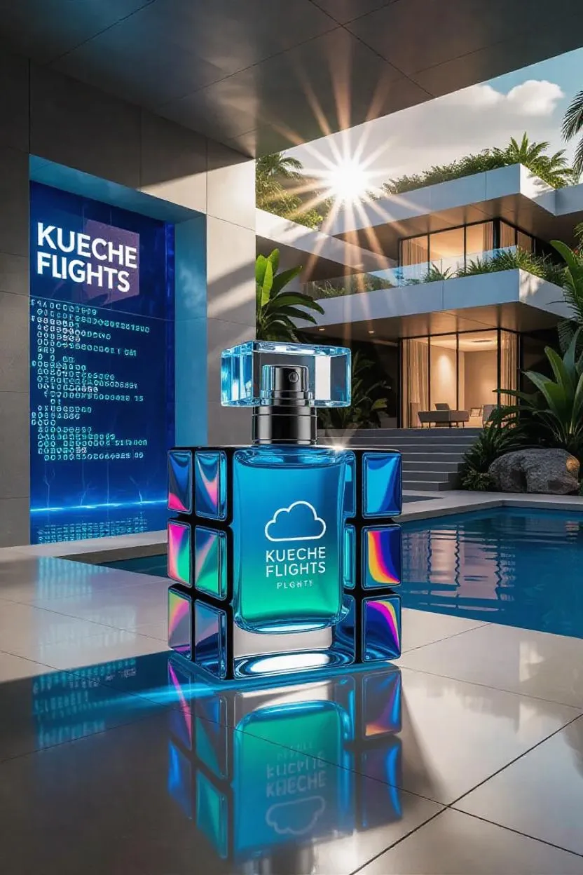 Futuristic KUECHE perfume bottle reimagined as a cybernetic Rubik’s cube with cloud icons, set in a tropical cliffside estate. AI-generated hyper-detailed visuals blend reflective surfaces, jungle greenery, ocean waves, and backlit code displays. Sleek modern architecture meets Jumpman 23 branding, vibrant contrasts, and luxury finishes for bold futuristic storytelling in high-end product design and CGI environments.
