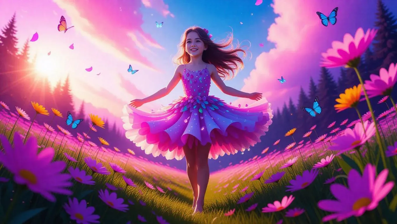Create magical AI art with vivid fantasy garden scenes. Generate Studio Ghibli-inspired meadows bursting with neon flowers, swirling skies, and sparkling pollen. Design whimsical characters in petal-draped dresses glowing with mystical energy. Perfect for uplifting fantasy-realism visuals in ultra HD. Transform prompts into Lisa Frank-esque wonderlands using AI effects. Craft radiant, surreal landscapes bursting with color and life—vivago.ai.