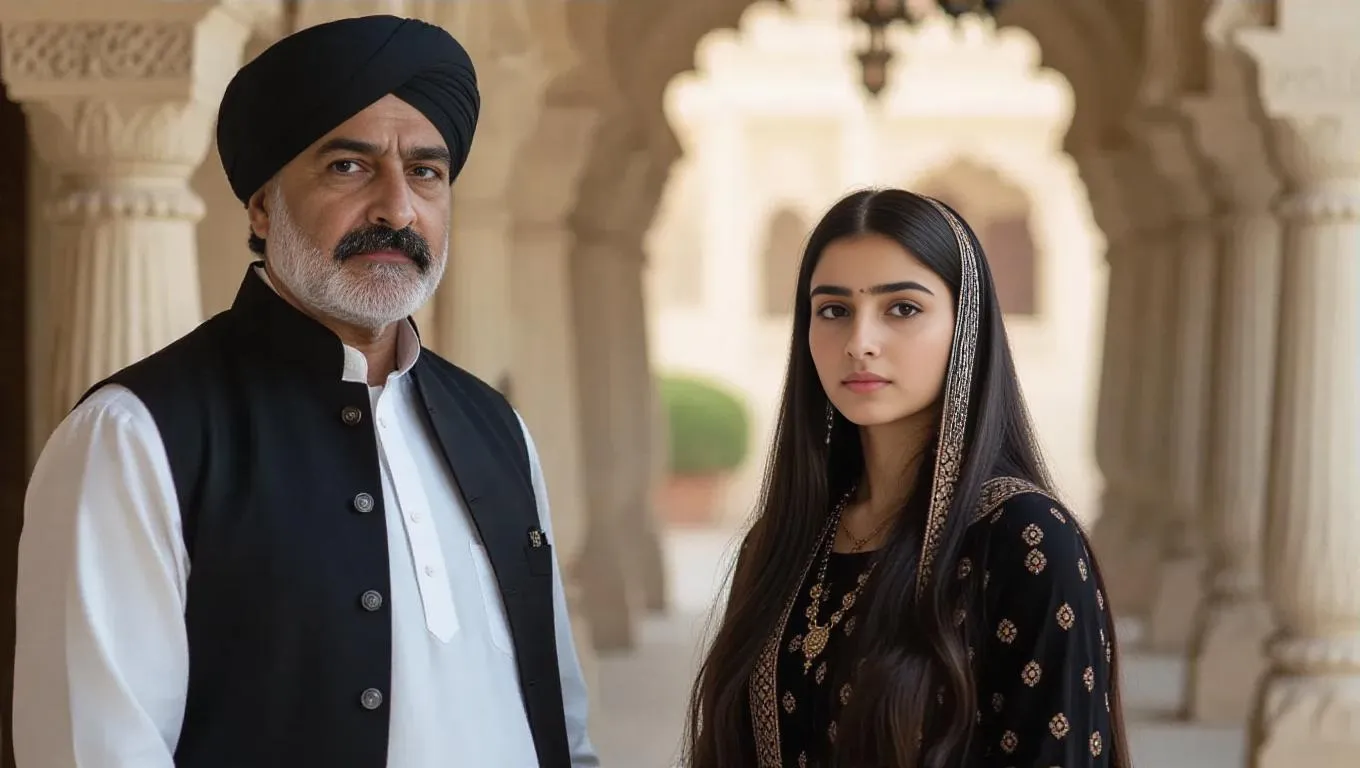 Generate a vivid AI image of a strict, turbaned uncle (dark skin, white kurta-pajama, black vest, thick mustache) confronting a timid 18-year-old girl (Arooj). Perfect for cultural storytelling, character design, or dramatic scenes. Leverage AI-powered tools to create detailed generational tension, traditional attire contrasts, and intense emotional expressions for visual narratives or creative projects.