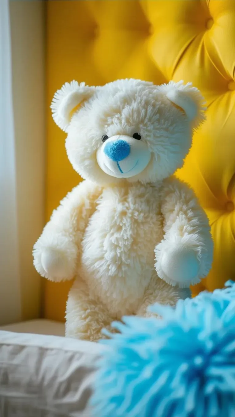 Create a whimsical AI-generated image of a white teddy bear stripped to the waist, standing on a yellow mat with blue tufts in a cozy room. Explore vivid details and playful designs with Vivgo.ai's AI art tools for custom plush toy visuals, creative close-ups, and unique character illustrations.