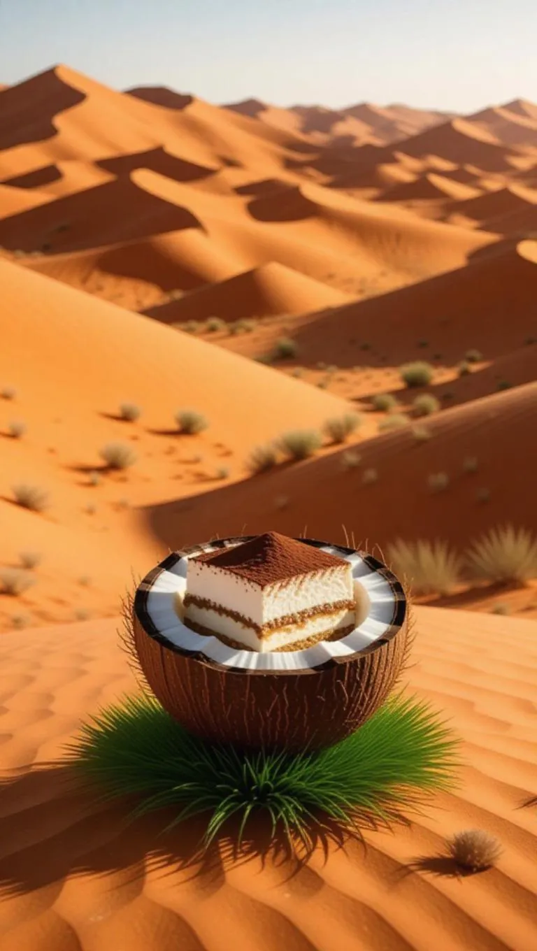 Create a surreal AI-generated image of tiramisu in a coconut half resting on a grassy oasis amid desert sands. Transform your vision into striking visuals with vivago.ai's AI tools, blending text prompts into professional-grade, imaginative art for unique culinary-nature fusion scenes.