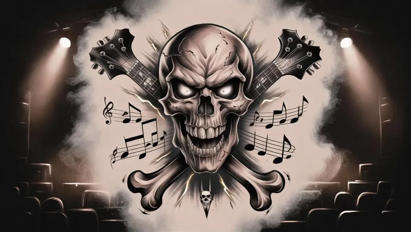Create an edgy rock and roll tattoo design blending skull and crossbones motifs for bold sleeve or chest pieces. Perfect for light-background t-shirt art, this AI-generated artwork merges vintage rebellion with modern aesthetics. Craft vibrant, customizable tattoo-inspired graphics for music-themed apparel or ink using AI tools.