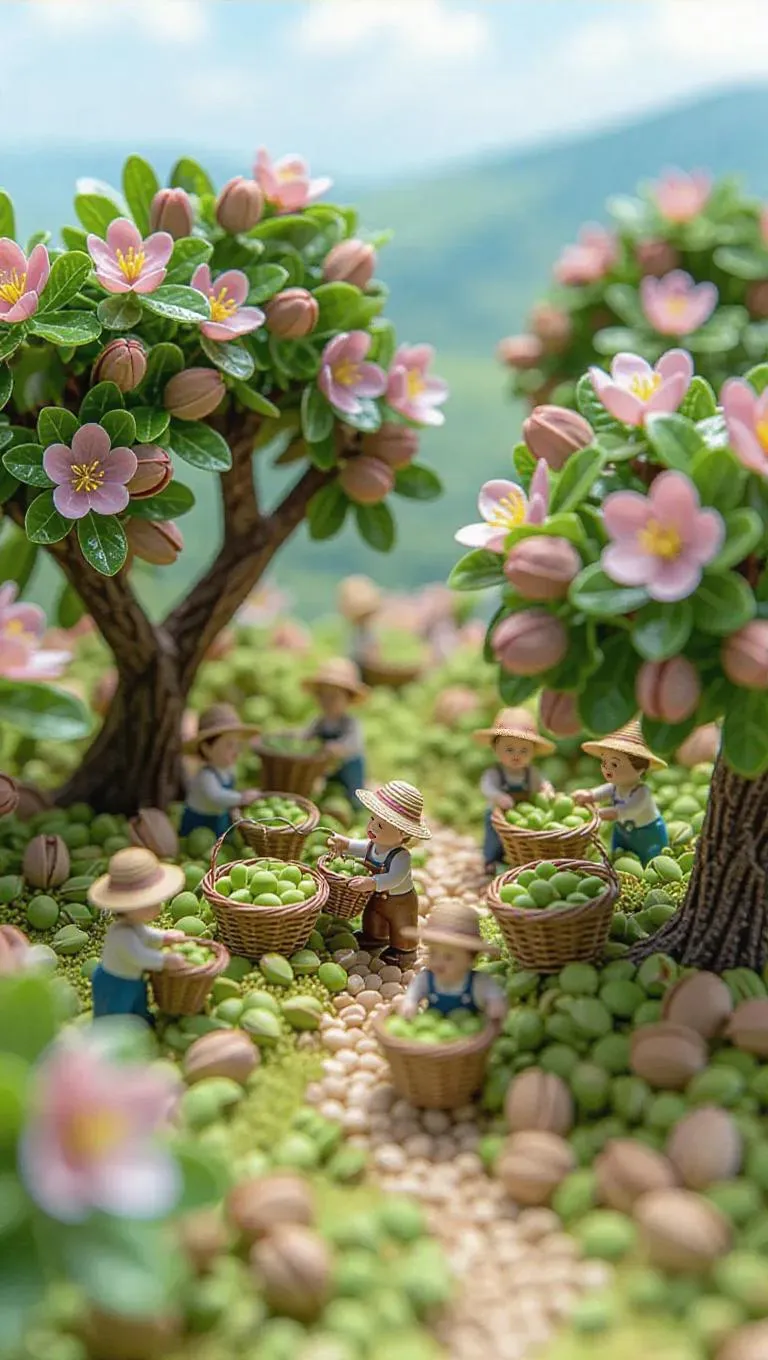 Generate AI images of tiny people harvesting pistachios, cashews, and nuts. Create vibrant, detailed visuals with vivago.ai's AI tools. Transform text prompts into creative scenes of miniature harvesters collecting fresh nuts in imaginative settings. Ideal for unique content, ads, or storytelling projects.