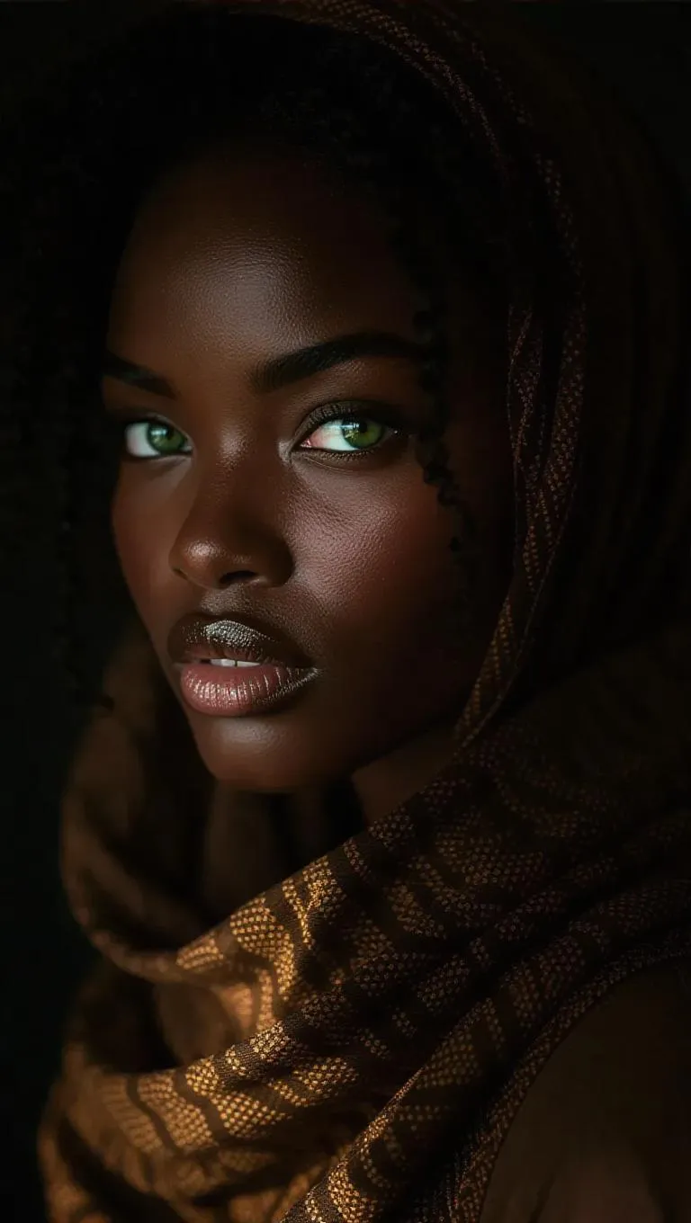 Dark fantasy portrait of a black woman with green eyes, brown scarf, and villainous expression. Photorealistic 8K rendering with cinematic lighting, high contrast HDR, and intricate fabric details. Inspired by Tom Bagshaw and Yoann Lossel's dark realism—moody atmosphere, muted palette, rich textures, dramatic shadows. Perfect for high-definition dark fantasy art lovers seeking cinematic, detailed character designs.