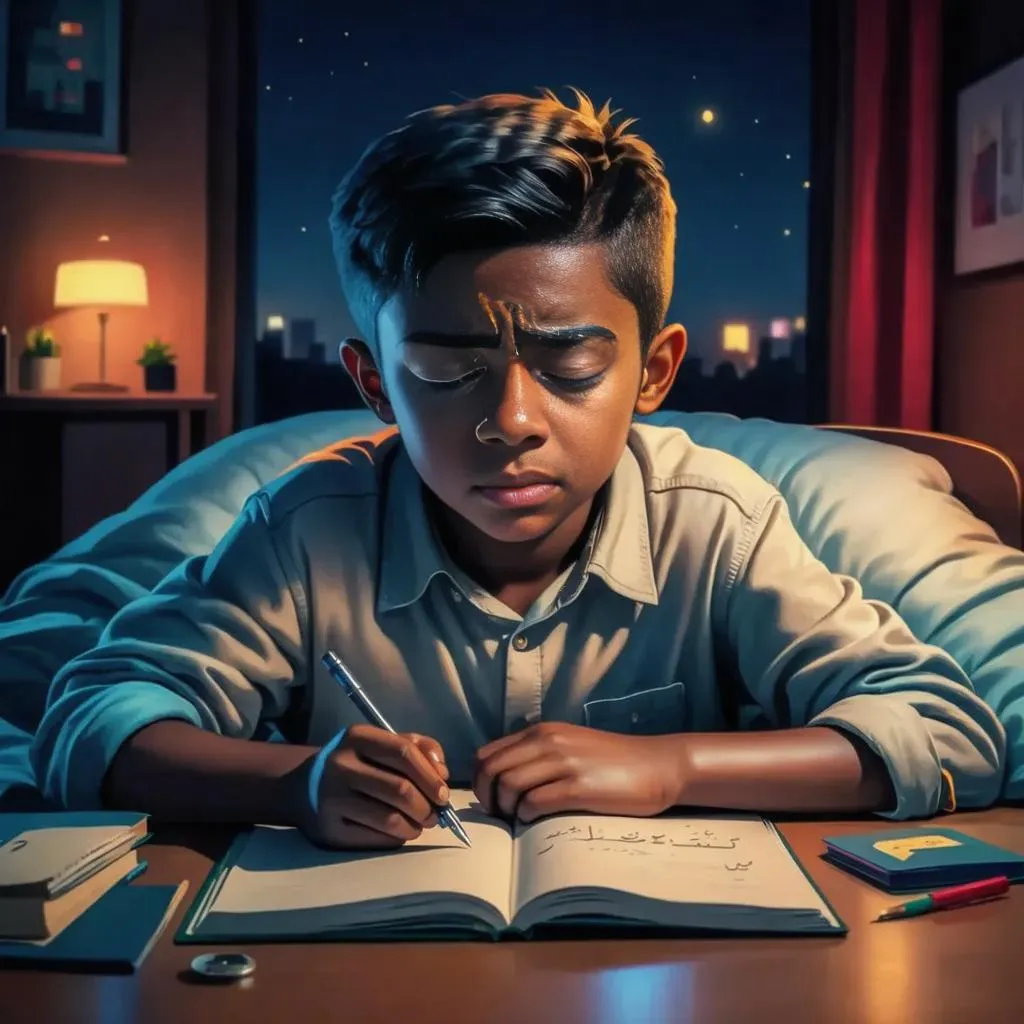 Create realistic AI-generated visuals of Ahmed, a determined 12-14-year-old boy in casual wear, studying late at his desk or resting tiredly. Perfect for motivational content, educational storytelling, and AI art projects. Transform prompts into lifelike scenes with Vivago.ai's creative tools for professional-grade character imagery.