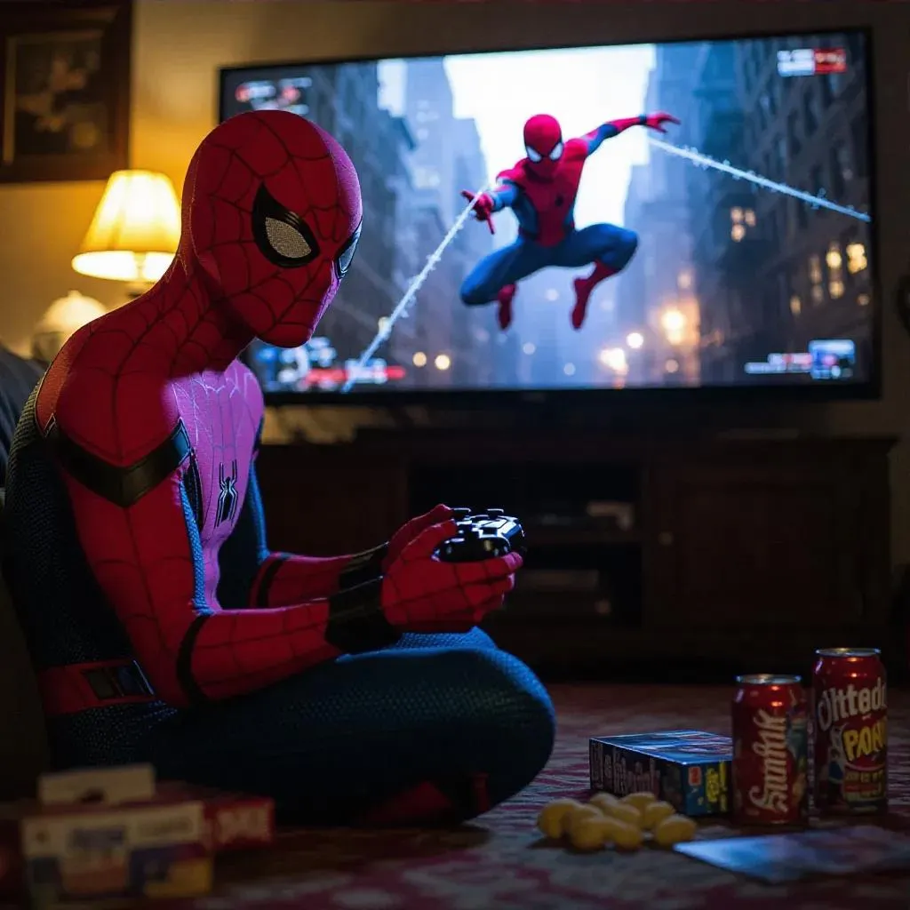 Spider-Man is sitting on the floor in a cozy, dimly lit living room, holding a game controller in both hands. He is playing a Spider-Man video game on a large flat-screen TV in front of him. The TV clearly shows gameplay of another Spider-Man swinging through the city. The glow from the screen reflects on his red and blue mask. Around him are scattered snacks, a soda can, and game boxes. His body posture is focused, slightly leaning forward. The scene should show both the real Spider-Man holding the controller and the game screen with the in-game Spider-Man in action. Funny, meta, well-lit, detailed room, cinematic vibes. Aspect ratio 16:9, realistic lighting, warm tones.