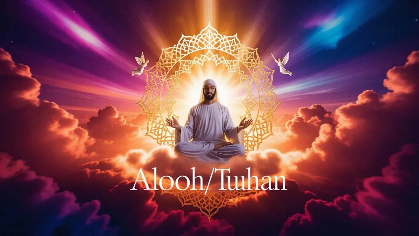 Generate a divine AI image of Tuhan Alloh in Surga with celestial light, golden arabesques, and angelic figures. Experience serene divinity, vibrant colors, and heavenly tranquility through AI-powered art, blending spiritual symbolism with ethereal beauty for captivating, professional-grade visual storytelling.