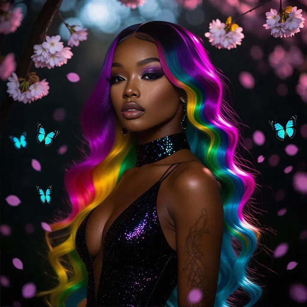 Vivago.ai crafts AI-generated visuals of a confident black woman with vibrant rainbow hair, glowing in a twilight forest. Create ethereal scenes with bioluminescent flora, cherry blossoms, and luminescent butterflies. Transform prompts into dynamic art featuring sleek attire, prismatic lighting, and dreamy pastel skies for professional-grade, imaginative storytelling.