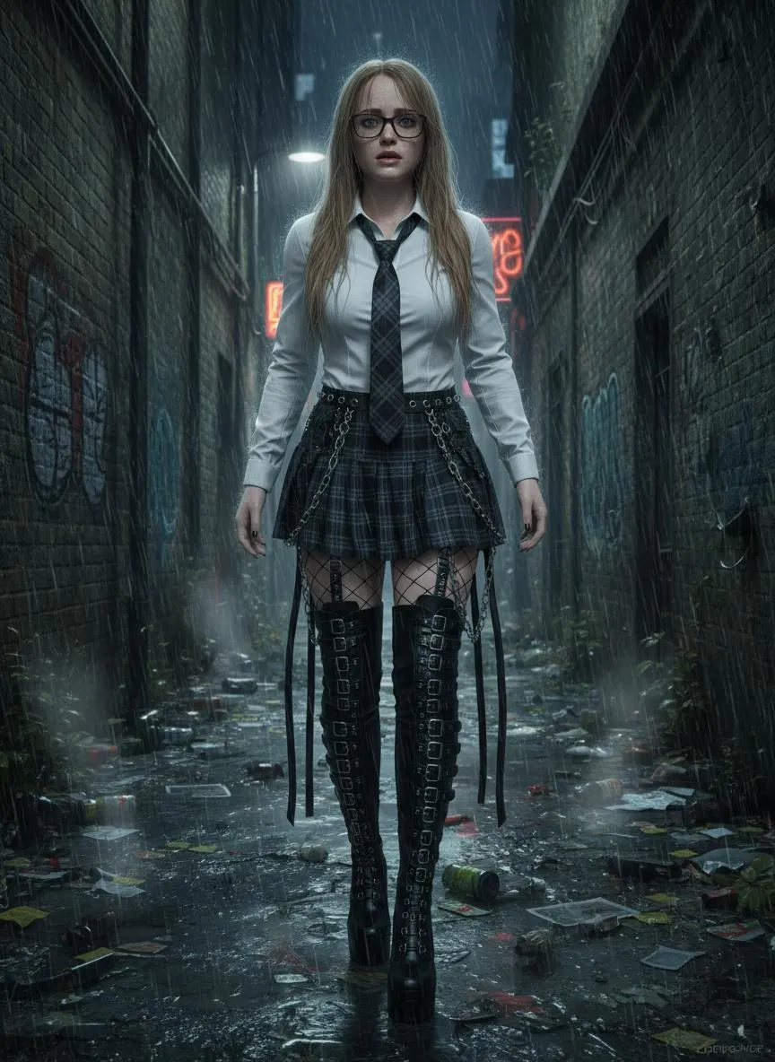 Generate realistic AI images of a gothic woman in glasses, white shirt, tartan tie/skirt, fishnet tights & thigh-high boots, nervously walking a rainy, dim alley in a crime-ridden metropolis. Create high-detail, fearful expressions with vivago.ai's powerful AI image generator.