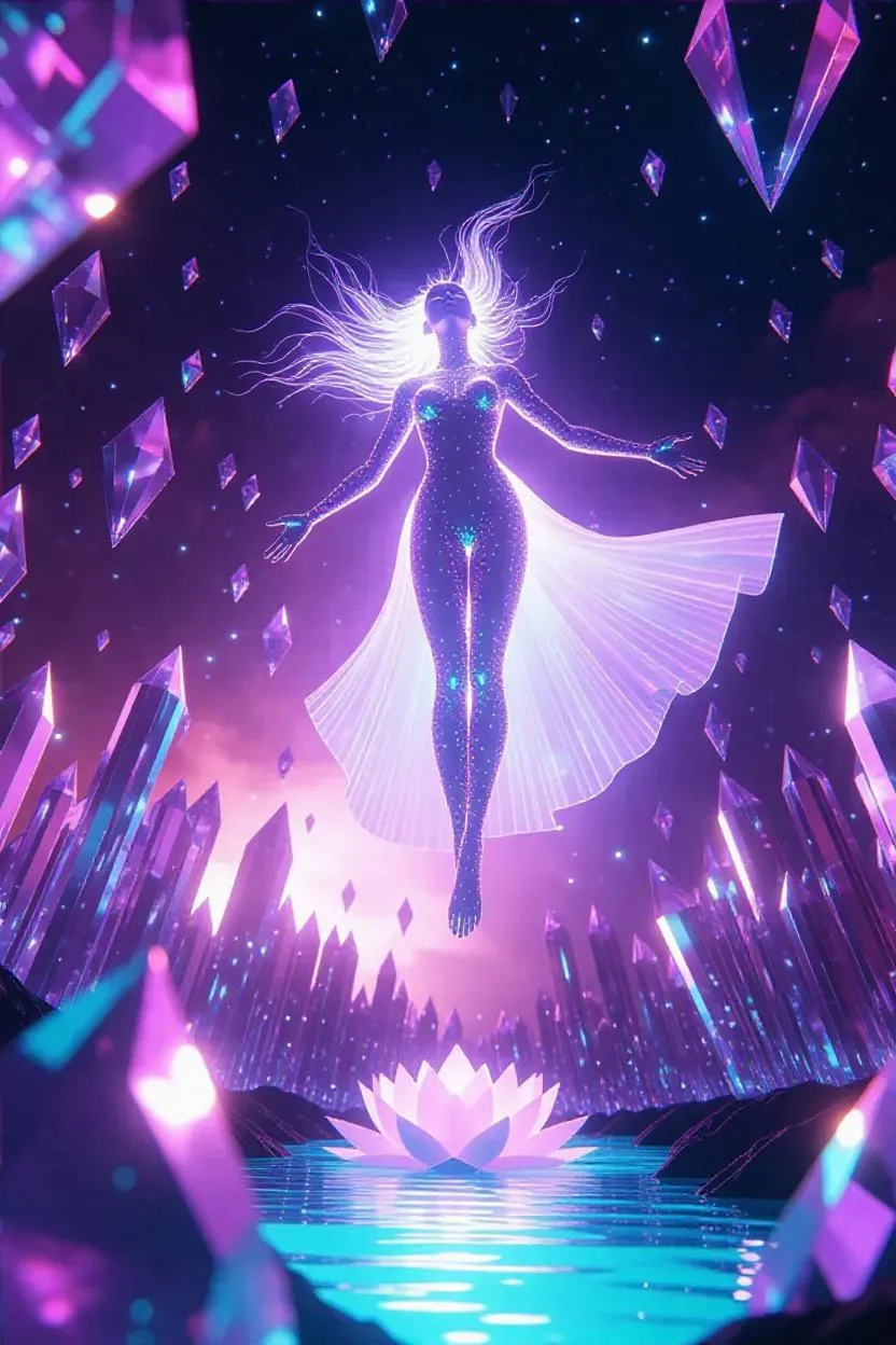 Immerse in a celestial dreamscape with AI-generated art: an ethereal woman glows amid crystal shards, her nebulae-like hair flowing. A lotus-shaped crystal city rises from a luminous sea, blending fantasy and sci-fi. Hyper-realistic visuals, Unreal Engine rendering, and surreal lighting in lavender, turquoise, and silver tones. Perfect for surreal digital artwork and sci-fi fantasy fusion enthusiasts.