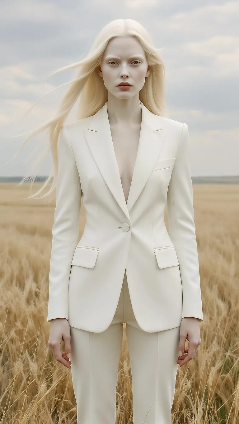 Hyper-realistic AI-generated fashion portrait of an albino woman in a tailored white suit, bathed in surreal crimson light against golden wild grass. Vivago.ai crafts striking contrasts between ethereal beauty and stark wilderness, with exquisite fabric textures, moody skies, and professional-grade visual tension. Transform prompts into high-end editorial imagery with AI precision.