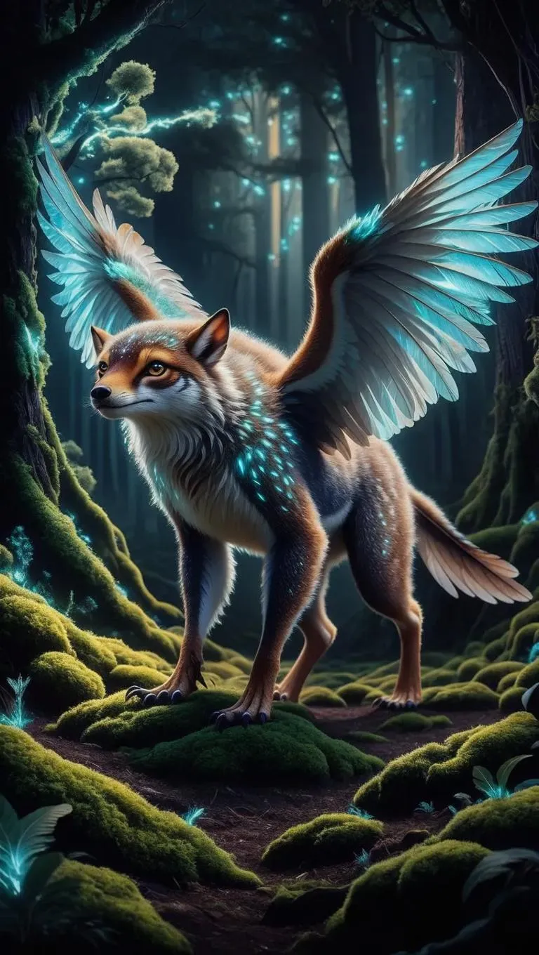 Discover a bioluminescent alien creature thriving in luminous blue forests. This nocturnal, arboreal mammal-bird hybrid features six legs, large eyes, and a glowing retractable antenna to lure prey. Vibrant colors blend with phosphorescent surroundings, utilizing bioluminescence for communication and hunting. Perfect blend of evolution and alien ecosystem adaptation.