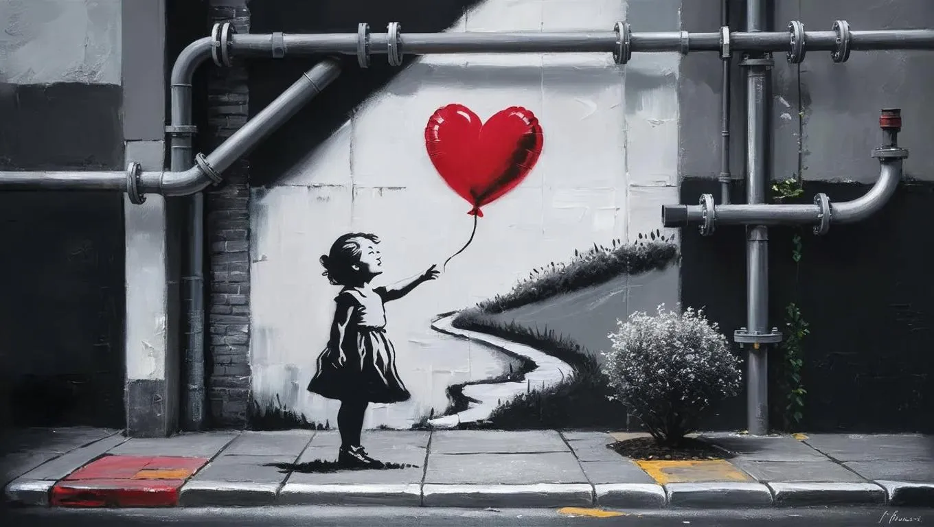Transform your vision into captivating cartoons with vivago.ai's AI generator. Depict a young girl reaching for a vibrant red heart-shaped balloon against a monochrome urban backdrop. Featuring dynamic symmetry, off-center composition, and graffiti-inspired elements like winding pipelines and shrubs, this artwork blends emotion with street art aesthetics effortlessly.