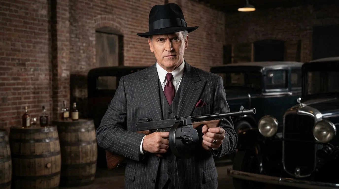 Make this man a gangster holding tommy gun