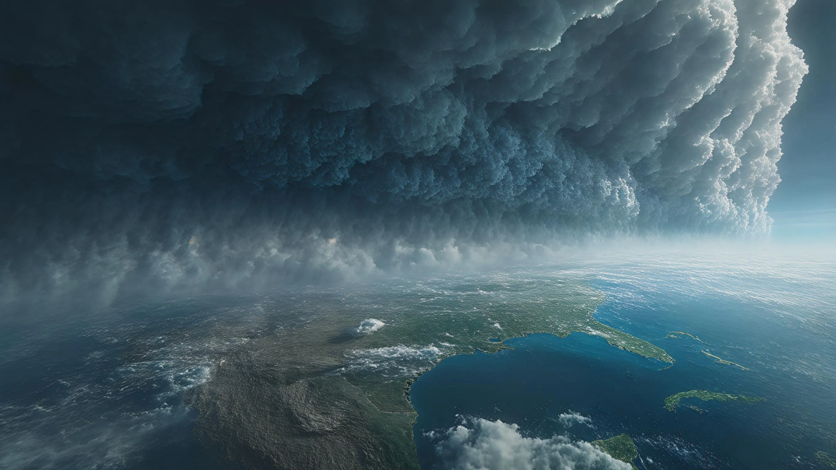 Visualize an apocalyptic planetary storm engulfing Earth with massive dark clouds. Experience AI-generated visuals of immense scale: helpless continents, dark cinematic atmosphere & imminent erasure. Create transformative, epic 16:9 visuals with VivaGo AI's image generator. Experience creation at cosmic scale. Explore AI-powered visual storytelling. (Word count: 49)