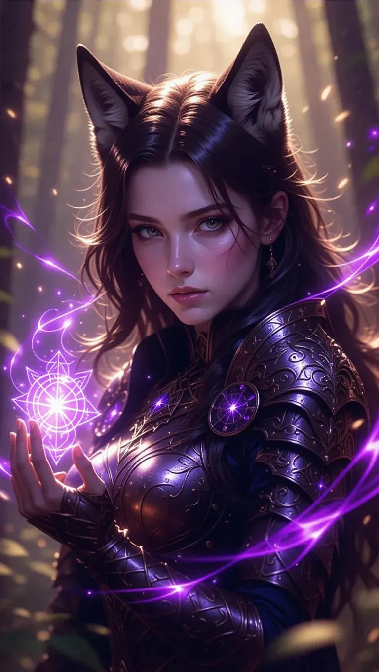 Immerse in a mystical AI-generated masterpiece: warrior and spirit wolf unite with swirling purple energy in an enchanted forest. Ultra-resolution (300dpi RGB), cinematic lighting, and vibrant colors highlight ornate armor, glowing runes, and bioluminescent flora. Professional-grade detail captures ethereal harmony between human and spirit realms, featuring golden light streams and abstract dreamscapes. Masterwork quality for digital art perfection.