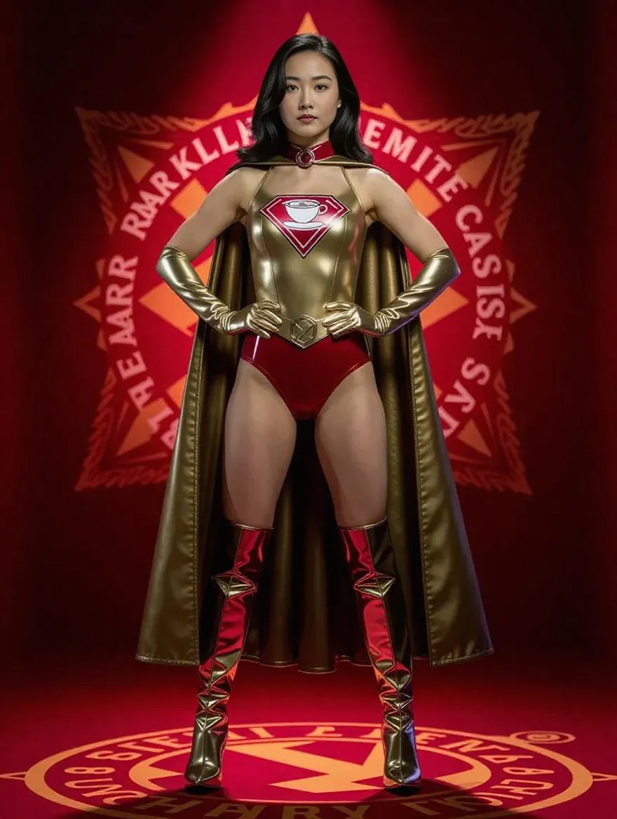 Transform into Pearl Milk Tea Lady superheroine with AI-generated movie effects. Experience 360° 4K HDR visuals showcasing krypton gold tights, Diamond Shield patterns, and pearl milk tea-themed accessories. Craft stunning superhero transformations with cinematic quality at 60fps. Highlight detailed elements like dark tea soup, black pearls, patent leather cape, gloves, and knee-high boots for professional-grade AI creativity.
