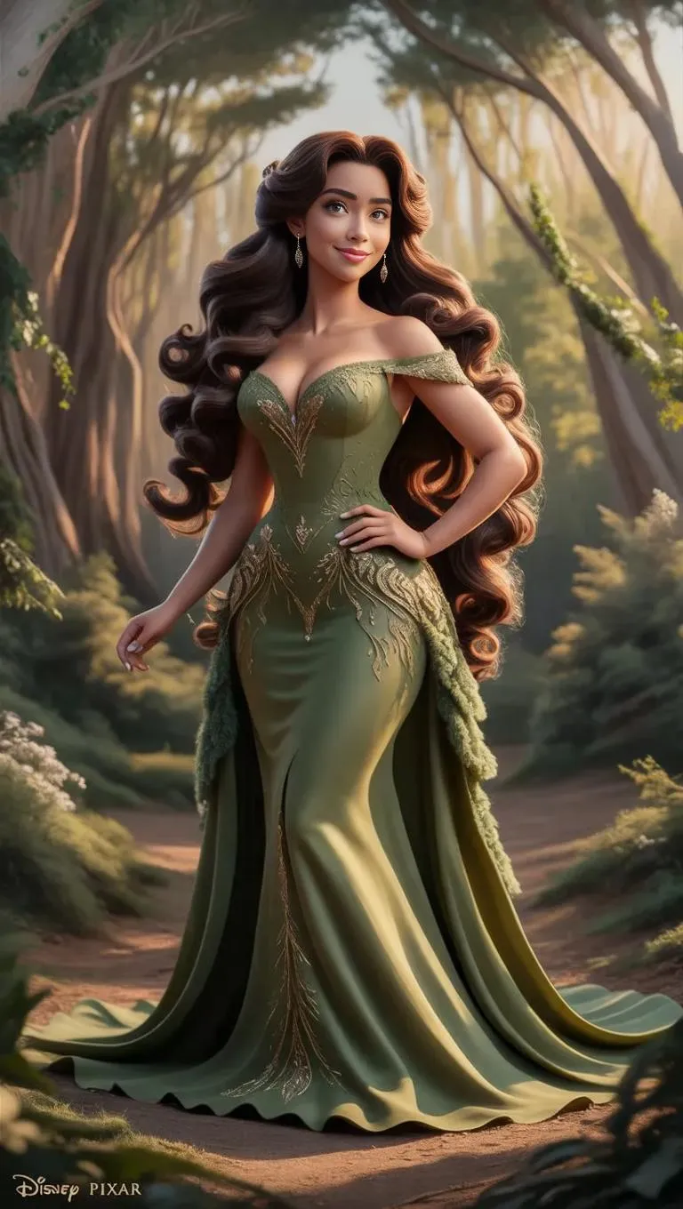 Create a Disney Pixar-style AI image of a curvy woman with flowing brown hair in an intricate olive-green dress, standing in a sunlit forest. Features hyper-realistic skin textures, detailed musculature, and professional DSLR quality for a captivating, safe visual. Perfect for AI art enthusiasts and digital creators.
