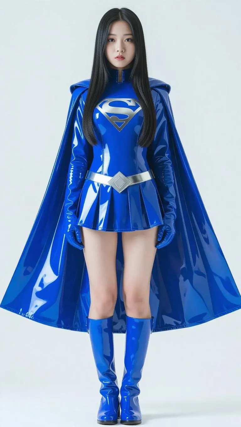 Generate a dynamic AI superheroine image featuring a Chinese college student in a bold blue patent leather combat uniform with Superman-inspired silver shield details. Full-body 360° view showcases Lycra tights, cape, short skirt, and boots in a powerful stance - legs apart, feet aligned within shoulder width. Ideal for professional AI-powered character design and text-to-visual transformations.