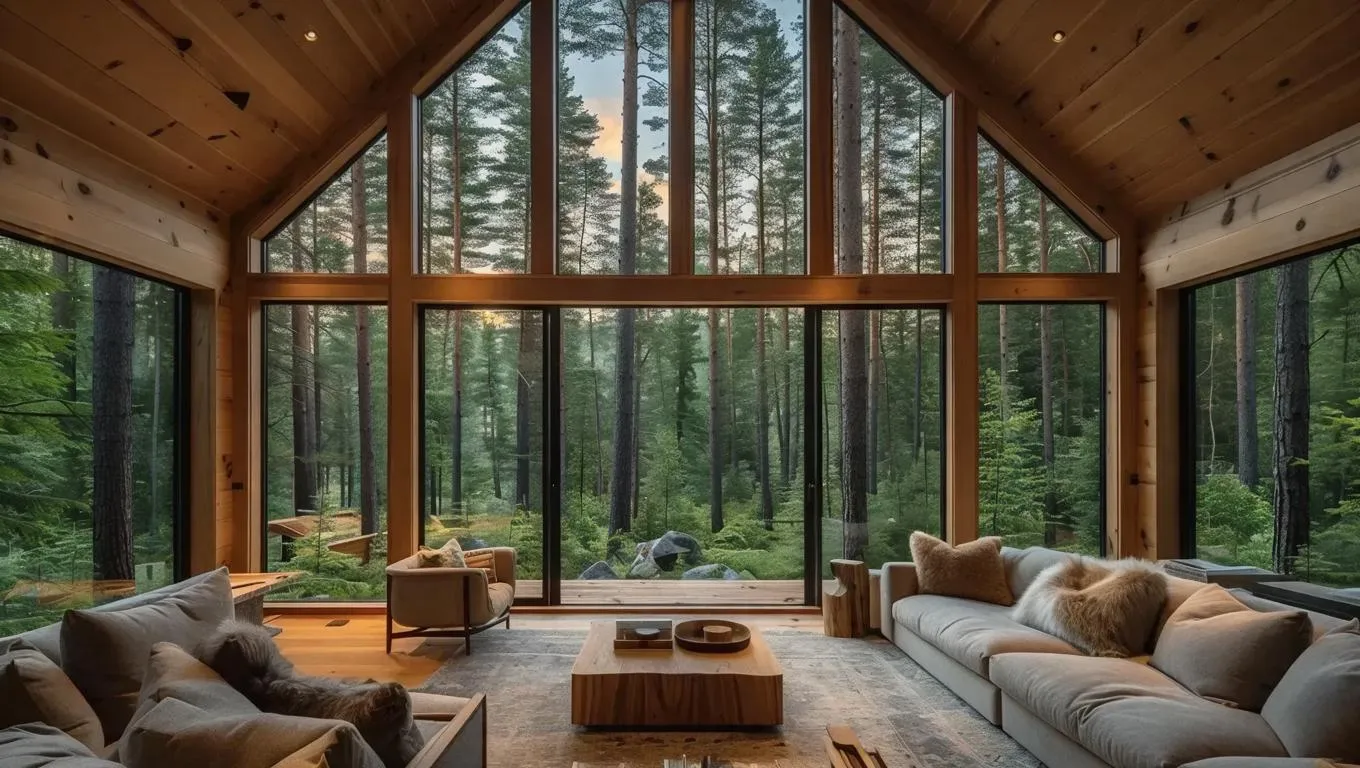 Experience a cozy cabin interior with a big soft room surrounded by lush forests. Our AI transforms text into serene woodland escapes, capturing warm cabin vibes and immersive forest views from within. Perfect for nature-inspired digital art and tranquil virtual settings.