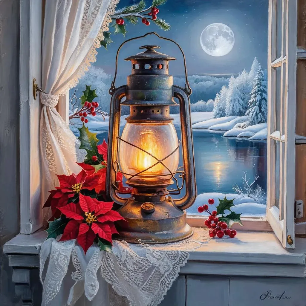 Generate a lifelike 3D oil painting of a vintage lantern emitting a soft golden glow, perched on a lace-curtained windowsill with festive poinsettias and holly berries. A serene moonlit winter landscape with a frosty lake completes this AI-crafted scene, blending nostalgic charm with hyperrealistic holiday ambiance. Perfect for seasonal digital art and AI-generated decor visuals.