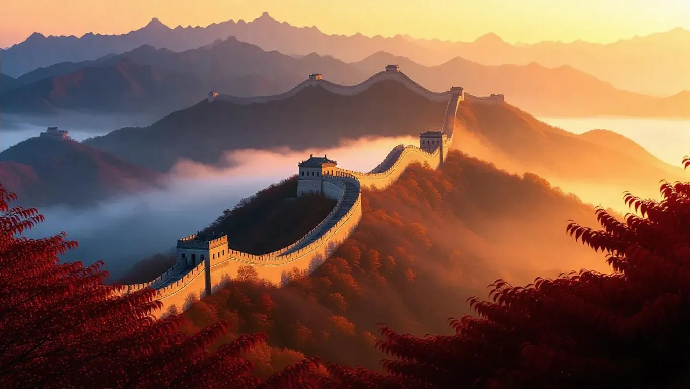 Generate a serene Chinese landscape with the Great Wall winding through misty mountains under a golden autumn sunrise. Vivago.ai transforms prompts into vibrant AI visuals, blending crimson foliage, ethereal fog, and ancient architecture for professional-grade creative projects. Elevate your art with AI-powered precision and natural beauty.