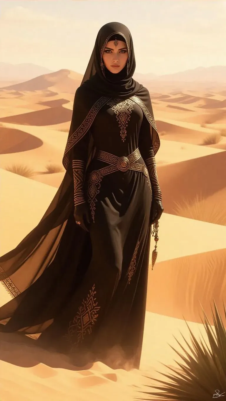 Generate a captivating AI image of a mysterious Arabic woman in stylish vector art, set against a serene desert oasis. Vivago.ai blends abstract motifs, sunlit dunes, and enigmatic allure, transforming prompts into professional visuals with curated AI effects for rich, daylight-inspired compositions.
