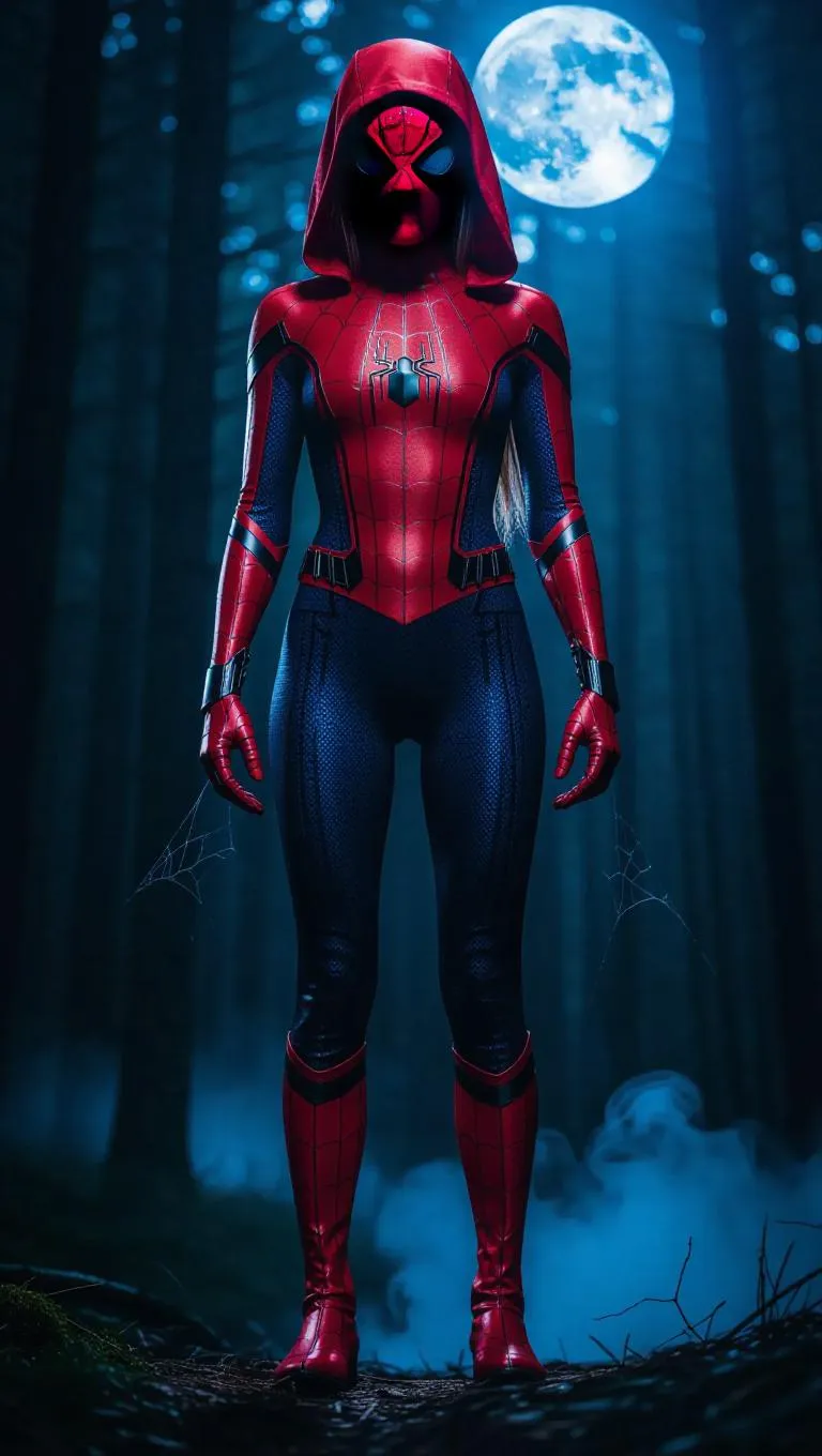“A heroic female Spider-person stands tall in the moonlit forest, wearing a tight, glossy red-and-blue suit woven with spiderweb patterns. Her masked face is turned slightly, her stance confident and powerful. Mist curls around her boots as soft blue light flickers