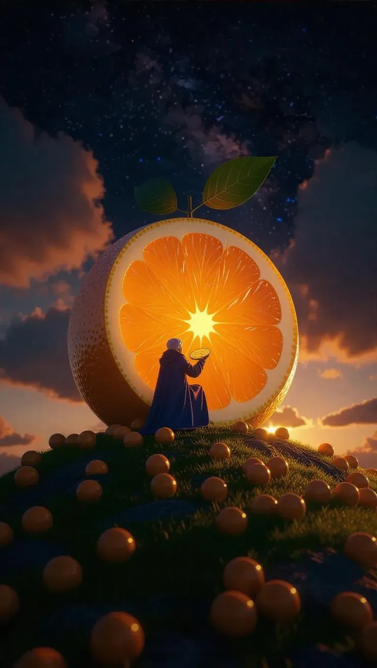 Explore AI-generated celestial wonders at vivago.ai's Orange Slice Observatory. Transform text prompts into surreal celestial landscapes featuring a whimsical fruit observatory with glowing orange architecture, transparent domes magnifying stars, and a blueberry-clad scholar studying fruit stone star maps. Digital concept art blending airbrush textures, colored pencil details, and pixel stars in dreamy orange-gold lighting. Create your cosmic visions with professional AI image generation tools.