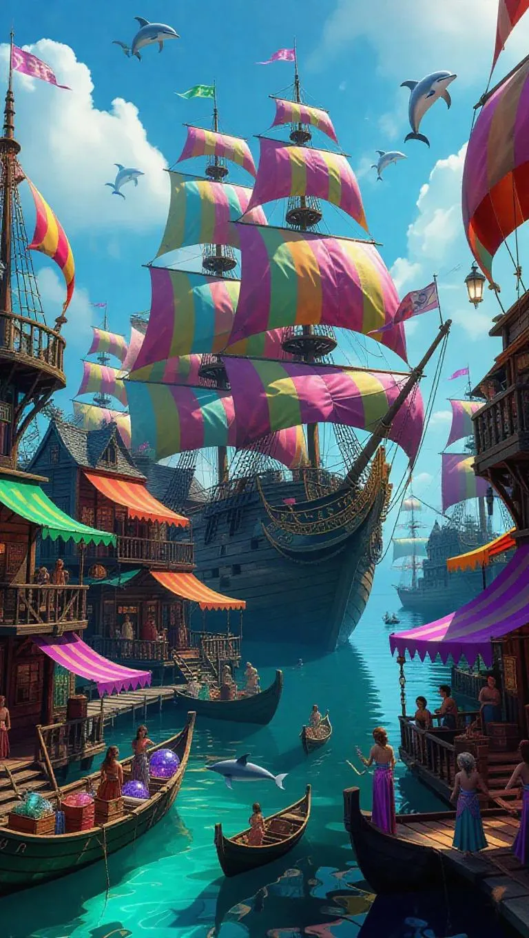 Explore an AI-generated fantasy bazaar where shipwrecks transform into floating markets, mermaids trade magical artifacts, and sea creatures orchestrate aquatic commerce. Dive into vivid AI visuals of glowing trenches, silk-canopied manta rays, and enchanted underwater wonders—perfect for creators seeking mystical marine worldbuilding through advanced AI image/video generation tools.