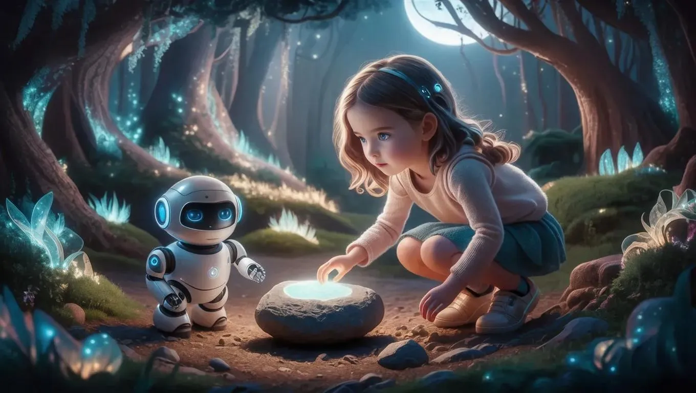 Ultra HD AI-generated art captures Luna's mystical dusk adventure in an enchanted forest with bioluminescent flora. As she uncovers a glowing stone, Robo-Gyaan materializes—a playful, futuristic AI robot with blue LED eyes. Dynamic visuals blend magical forests, cutting-edge effects, and AI-powered storytelling for professional-grade, ethereal imagery.