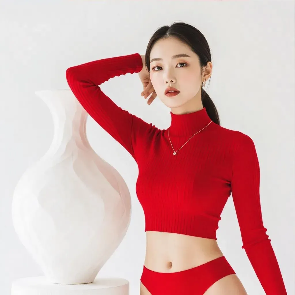AI-generated fashion photography of a Korean model with sculpted physique in bold red ribbed knitwear and high-cut bikini, posing beside curved white sculpture in minimalist studio. Professional-grade editing enhances skin texture, dynamic composition, and luxury fashion aesthetics through vivid crimson-white contrasts and sculptural lighting.