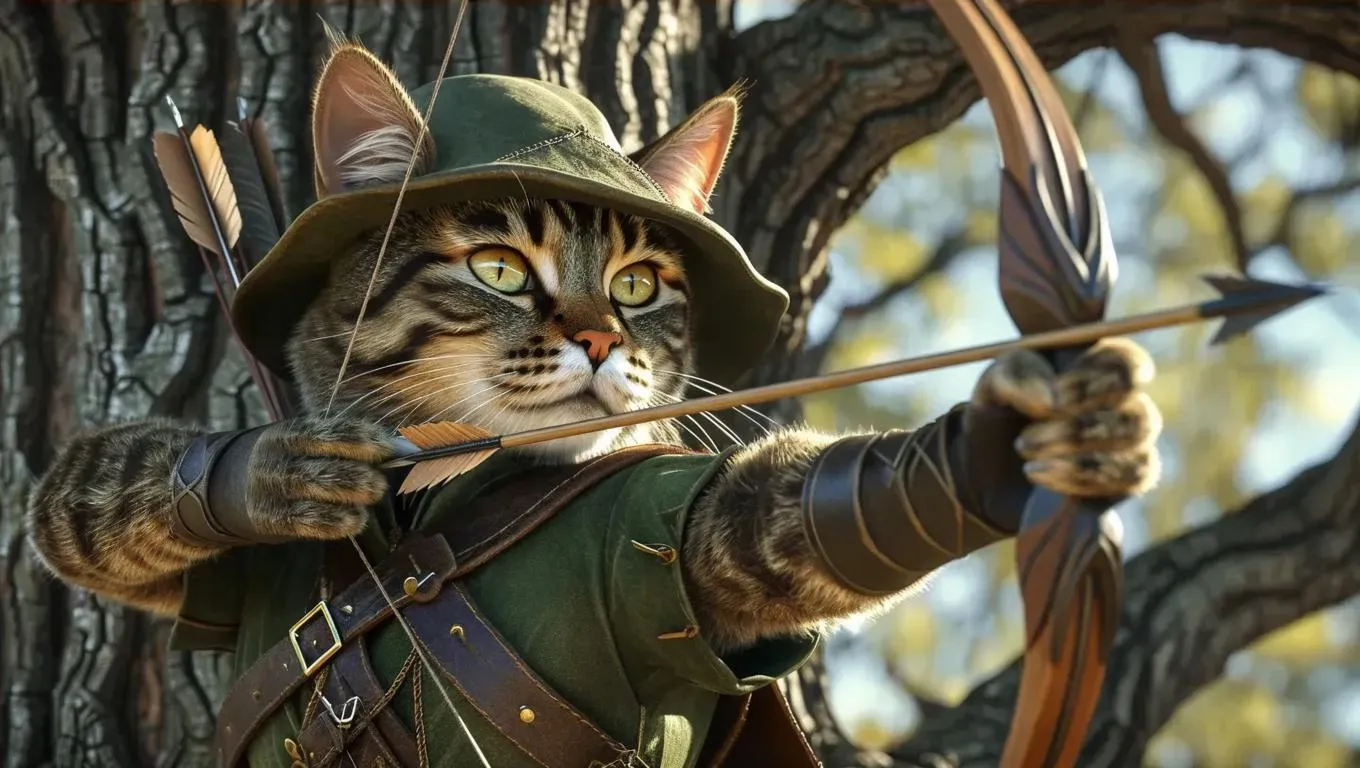 Generate hyperrealistic AI images of a humanoid cat in Robin Hood attire, aiming a bow at a target atop a gnarled oak. Perfect for fantasy storytelling, character design, and immersive digital art with vivago.ai's advanced AI image generation tools.